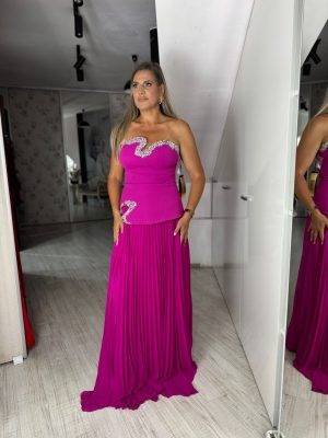 Rochie lunga rosie accesorizata cu pietricele argintii